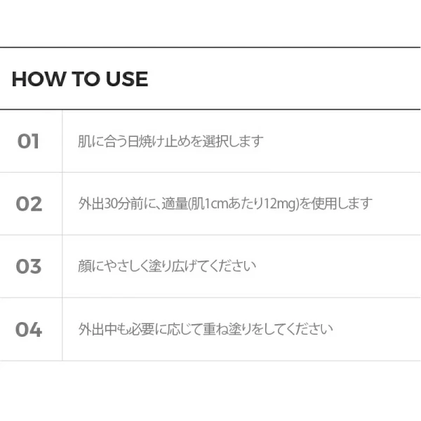 精製水、シクロペンタシロキサン、エチルヘキシルメトキシシンナメート、ブチレングリコール、エチルヘキシルサリチレート、ジンクオキシド、ジカプリリルカーボネート、ジプロピレングリコール、チタンジオキシド、ラウリルピイジ-8ジメチコン、 フィジー-10ジメチコン、ジメチコン、ジステアジモニウムヘクトライト、トコフェリルアセテート、硫酸マグネシウム、ジメチコン/ビニルジメチコンクロスポリマー、メチルメタクリレートクロスポリマー、フェニルトリメチコン、アルミニウムヒドロキシド、 ステアリン酸アルミニウム、メチコン、ポリグリセリル-6ポリシノリエート、グリセリルカプリレート、カプリリルグリコール、ジナトリウムジジチエイ、ユビキノン、ヒドロライズドコラーゲン、アセチルヘキサペプチド-8、香料 、フェノキシエタノール、ヒドロキシシトロネルアル、ブチルフェニルメチルプロピオナル、リナロール、シトロネロール、ヘキシルシンナモール、アルファ-イソメチルアイオノン