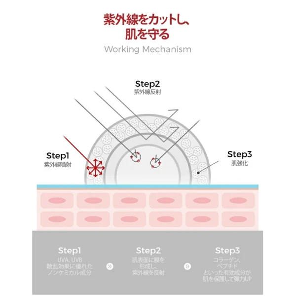 スキンケア成分をそのまま使用、肌の活力を高め強力な紫外線をカット+肌を守る!