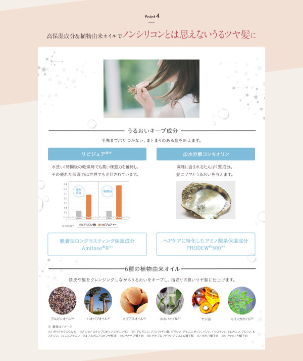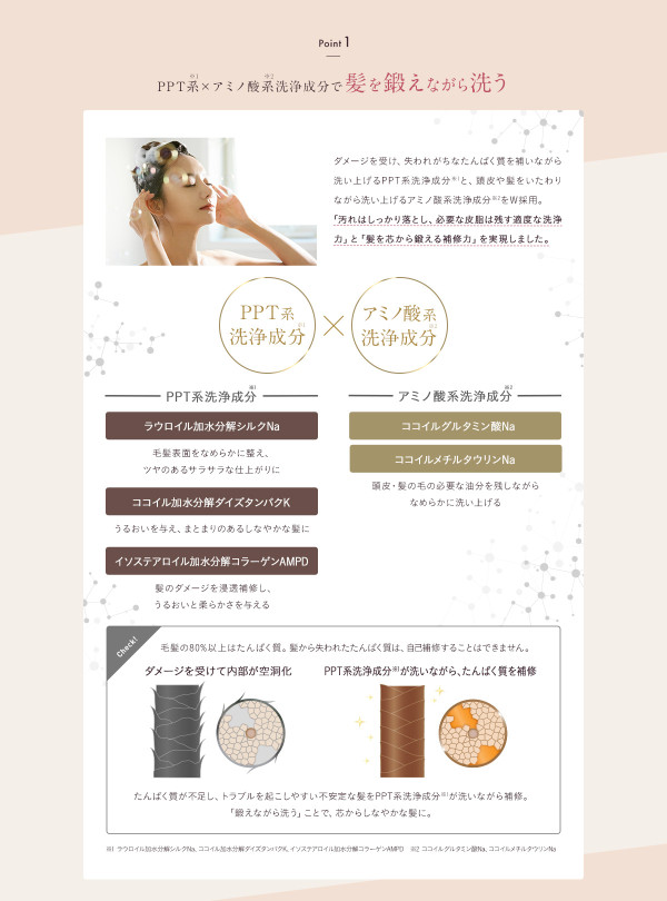 ※4理論値 ※5ラウロイル加水分解シルクNa、ココイル加水分解ダイズタンパクK、イソステアロイル加水分解コラーゲンAMPD ※6ココイルグルタミン酸Na、ココイルメチルタウリンNa