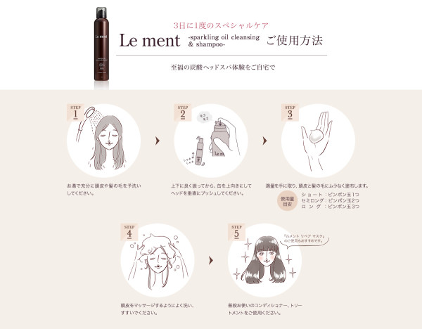ぬるま湯で頭皮や髪を予洗いしてください。缶を上下に良く振り上向きの状態で適量を手のひらに取ります。頭皮と髪にムラなく塗布し、指の腹で頭皮をやさしくマッサージするようによく洗い、しっかりすすいでください。