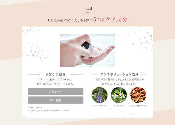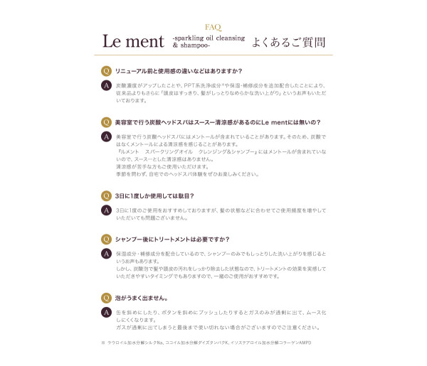 水、ココイルグルタミン酸Na、ラウリルベタイン、ココイルメチルタウリンNa、LPG、イソペンチルジオール、二酸化炭素、ラウロイル加水分解シルクNa、ココイル加水分解ダイズタンパクK、イソステアロイル加水分解コラーゲンAMPD、コカミドメチルMEA、アルガニアスピノサ核油、バオバブ種子油、テオブロマグランジフロルム種子脂、ホホバ種子油、ワサビノキ種子油、ヤシ油、加水分解ケラチン(羊毛)、加水分解ケラチン(羽毛)、加水分解ダイズタンパク、加水分解コンキオリン、ヘマチン、ヒドロキシエチルウレア、ラウロイルグルタミン酸ジ(フィトステリル/オクチルドデシル)、ジラウロイルグルタミン酸リシンNa、ゼイン、キシリチルグルコシド、無水キシリトール、マルチトール、キシリトール、クオタニウム-18、クオタニウム-33、ポリクオタニウム-10、ポリクオタニウム-50、ポリクオタニウム-51、フラーレン、セラミドNG、セラミドNP、セラミドAP、ジヒドロキシプロピルアルギニンHCl、PCA-Na、乳酸Na、アルギニン、アスパラギン酸、PCA、グリシン、アラニン、セリン、バリン、プロリン、トレオニン、イソロイシン、ヒスチジン、フェニルアラニン、ローヤルゼリーエキス、グリチルリチン酸2K、レスベラトロール、ナイアシンアミド、パンテノール、グリセリン、ラウロイルアルギニン、(メタクリル酸グリセリルアミドエチル/メタクリル酸ステアリル)コポリマー、ココイルアルギニンエチルPCA、エルゴチオネイン、リンゴ果実培養細胞エキス、トリ(カプリル酸/カプリン酸)グリセリル、セロリ種子エキス、デキストラン、アセチルヘキサペプチド-1、フルボ酸、オウゴン根エキス、ドクダミエキス、ワサビノキ種子エキス、セージ葉エキス、カミツレ花エキス、ローズマリー葉エキス、スギナエキス、ホップエキス、セイヨウアカマツ球果エキス、レモン果実エキス、マコンブエキス、センブリエキス、カンゾウ根エキス、ハトムギ種子エキス、コンフリー葉エキス、シャクヤク根エキス、モモ葉エキス、セイヨウオオバコ種子エキス、サピンヅストリホリアツス果実エキス、ペルベチアカナリクラタエキス、BG、ベタイン、PVP、リン酸2Na、フェノキシエタノール、エタノール、PG、クエン酸、EDTA-2Na、塩化Na、コレステロール、キサンタンガム、レシチン、ペンチレングリコール、香料