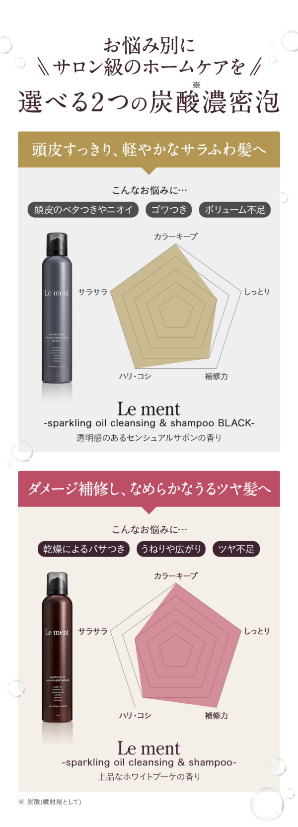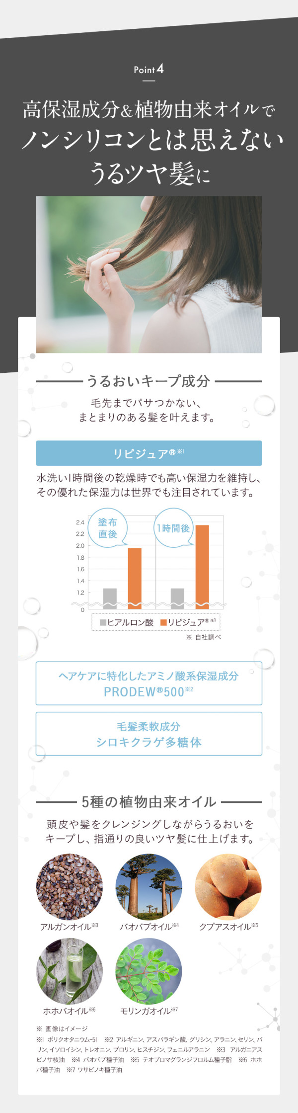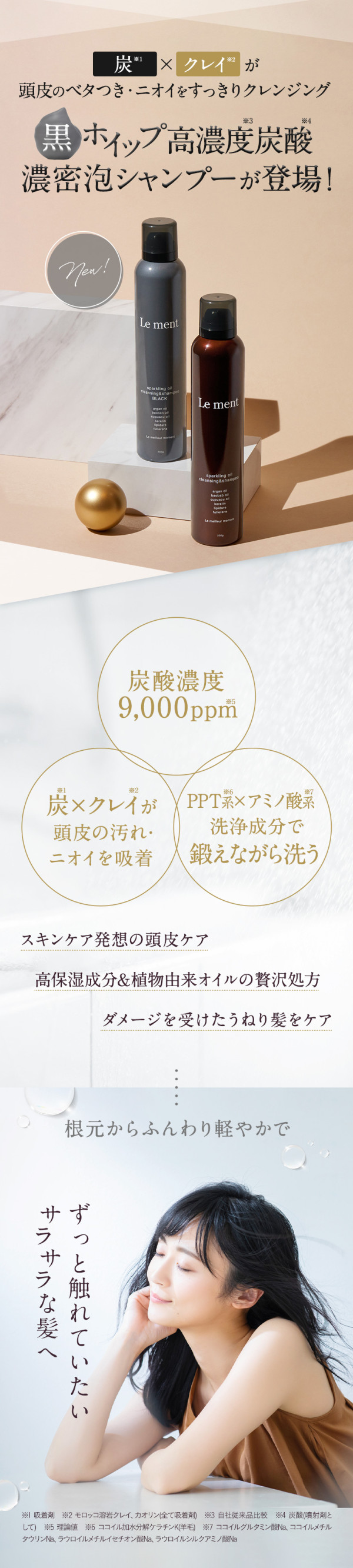 ※1吸着剤 ※2モロッコ溶岩クレイ、 カオリン(全て吸着剤) ※3 自社従来品比較 ※4 炭酸噴射剤とし て) ※5シリーズ内 ※6理論値 ※7ココイル加水分解ケラチンK(羊毛) ※8ココイルグルタミン酸Na、ココイルメチルタウリンNa、ラウロイルメチルイセチオン酸Na、ラウロイルシルクアミノ酸Na
