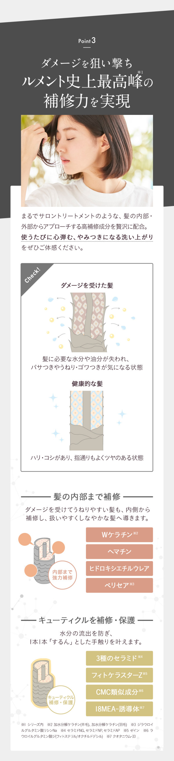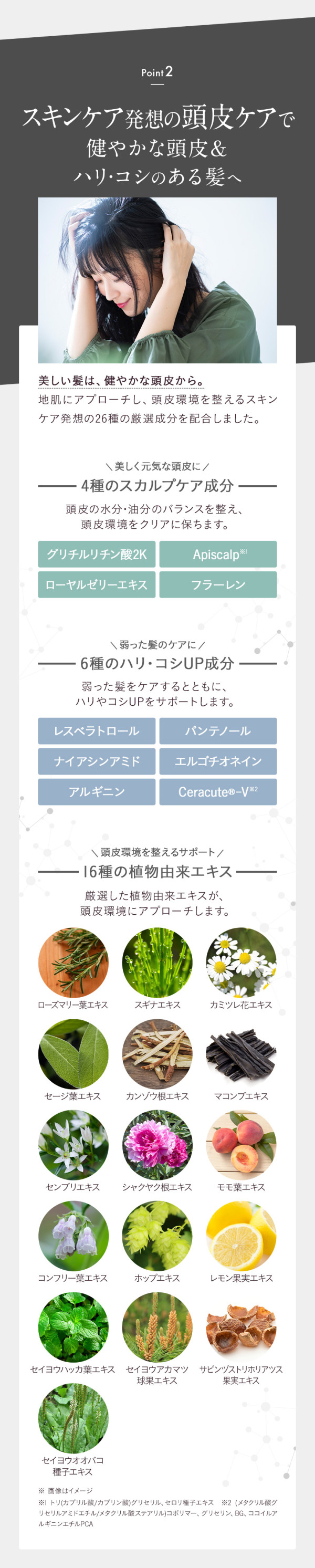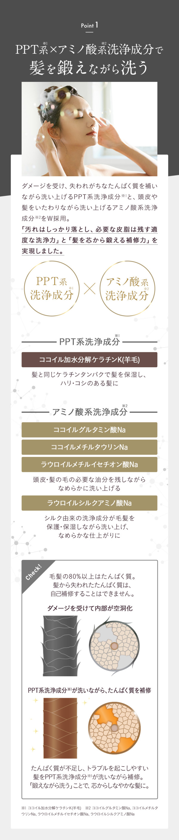 ※1吸着剤 ※2モロッコ溶岩クレイ、 カオリン(全て吸着剤) ※3 自社従来品比較 ※4 炭酸噴射剤とし て) ※5シリーズ内 ※6理論値 ※7ココイル加水分解ケラチンK(羊毛) ※8ココイルグルタミン酸Na、ココイルメチルタウリンNa、ラウロイルメチルイセチオン酸Na、ラウロイルシルクアミノ酸Na