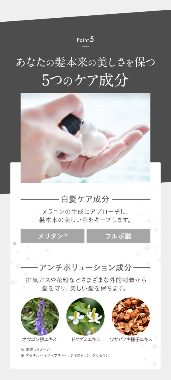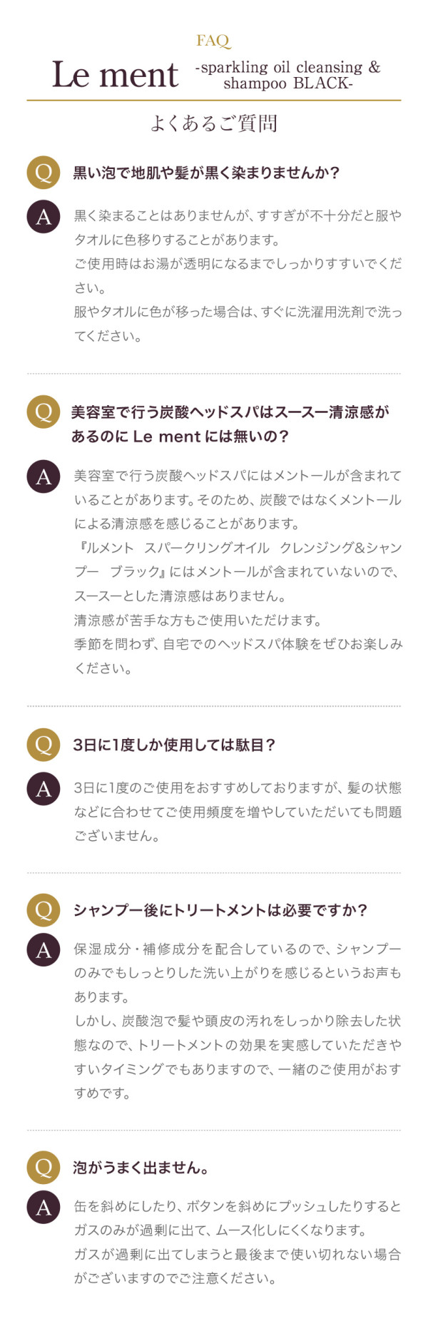 水、ココイルグルタミン酸Na、ラウリルベタイン、ココイルメチルタウリンNa、LPG、二酸化炭素、ココイル加水分解ケラチンK(羊毛)、ラウロイルメチルイセチオン酸Na、ラウロイルシルクアミノ酸Na、コカミドDEA、炭、モロッコ溶岩クレイ、カオリン、アルガニアスピノサ核油、バオバブ種子油、テオブロマグランジフロルム種子脂、ホホバ種子油、ワサビノキ種子油、加水分解ケラチン(羊毛)、加水分解ケラチン(羽毛)、ヘマチン、ヒドロキシエチルウレア、ラウロイルグルタミン酸ジ(フィトステリル/オクチルドデシル)、ジラウロイルグルタミン酸リシンNa、ゼイン、クオタニウム-18、クオタニウム-33、ポリクオタニウム-10、ポリクオタニウム-51、ポリグリセリン-10、フラーレン、セラミドNG、セラミドNP、セラミドAP、シロキクラゲ多糖体、PCA-Na、乳酸Na、アルギニン、アスパラギン酸、PCA、グリシン、アラニン、セリン、バリン、プロリン、トレオニン、イソロイシン、ヒスチジン、フェニルアラニン、ローヤルゼリーエキス、グリチルリチン酸2K、レスベラトロール、ナイアシンアミド、パンテノール、グリセリン、(メタクリル酸グリセリルアミドエチル/メタクリル酸ステアリル)コポリマー、ココイルアルギニンエチルPCA、エルゴチオネイン、トリ(カプリル酸/カプリン酸)グリセリル、セロリ種子エキス、デキストラン、アセチルヘキサペプチド-1、フルボ酸、オウゴン根エキス、ドクダミエキス、ワサビノキ種子エキス、セージ葉エキス、カミツレ花エキス、ローズマリー葉エキス、スギナエキス、ホップエキス、セイヨウアカマツ球果エキス、レモン果実エキス、マコンブエキス、センブリエキス、カンゾウ根エキス、セイヨウハッカ葉エキス、コンフリー葉エキス、シャクヤク根エキス、モモ葉エキス、セイヨウオオバコ種子エキス、サピンヅストリホリアツス果実エキス、アプリコット核油ポリグリセリル-6エステルズ、ステアリン酸ポリグリセリル-10、ミリスチン酸ポリグリセリル-10、グアーヒドロキシプロピルトリモニウムクロリド、BG、ベタイン、PVP、リン酸2Na、フェノキシエタノール、エタノール、PG、クエン酸、EDTA-2Na、塩化Na、トコフェロール、コレステロール、デヒドロ酢酸Na、ペンチレングリコール、香料
