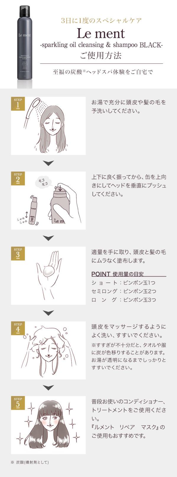 ぬるま湯で頭皮や髪を予洗いしてください。缶を上下に良く振り上向きの状態で適量を手のひらに取ります。頭皮と髪にムラなく塗布し、指の腹で頭皮をやさしくマッサージするようによく洗い、しっかりすすいでください。