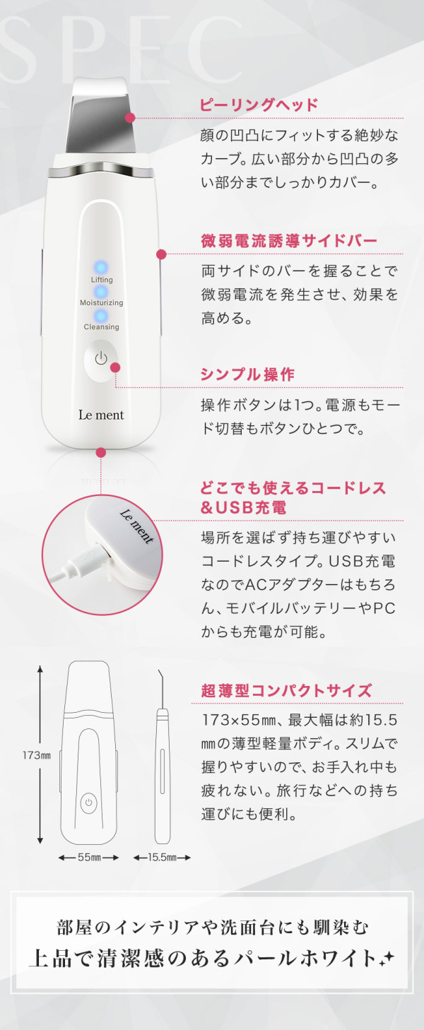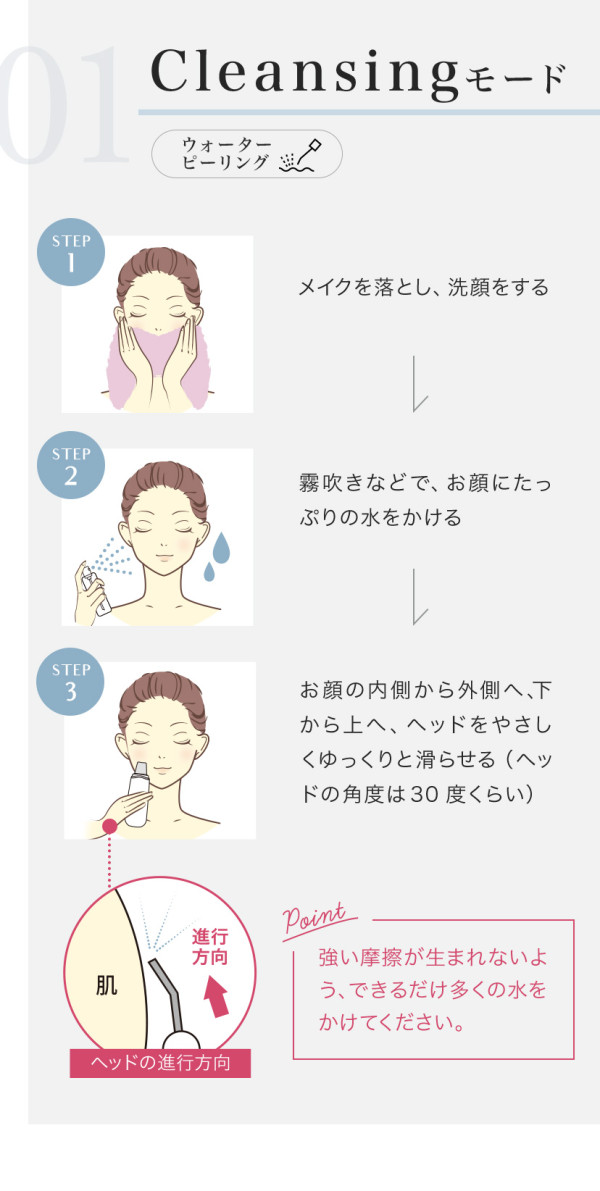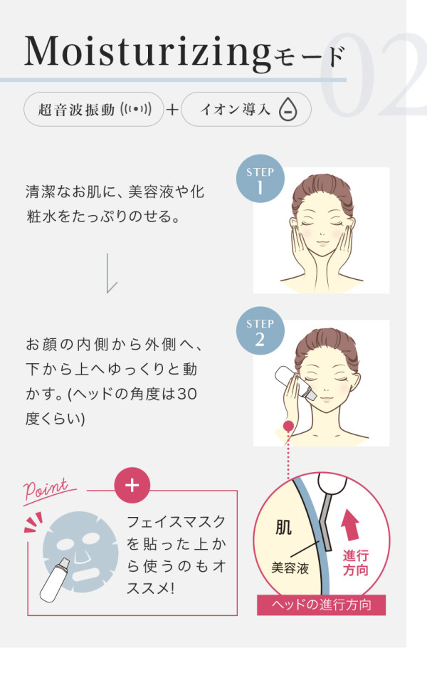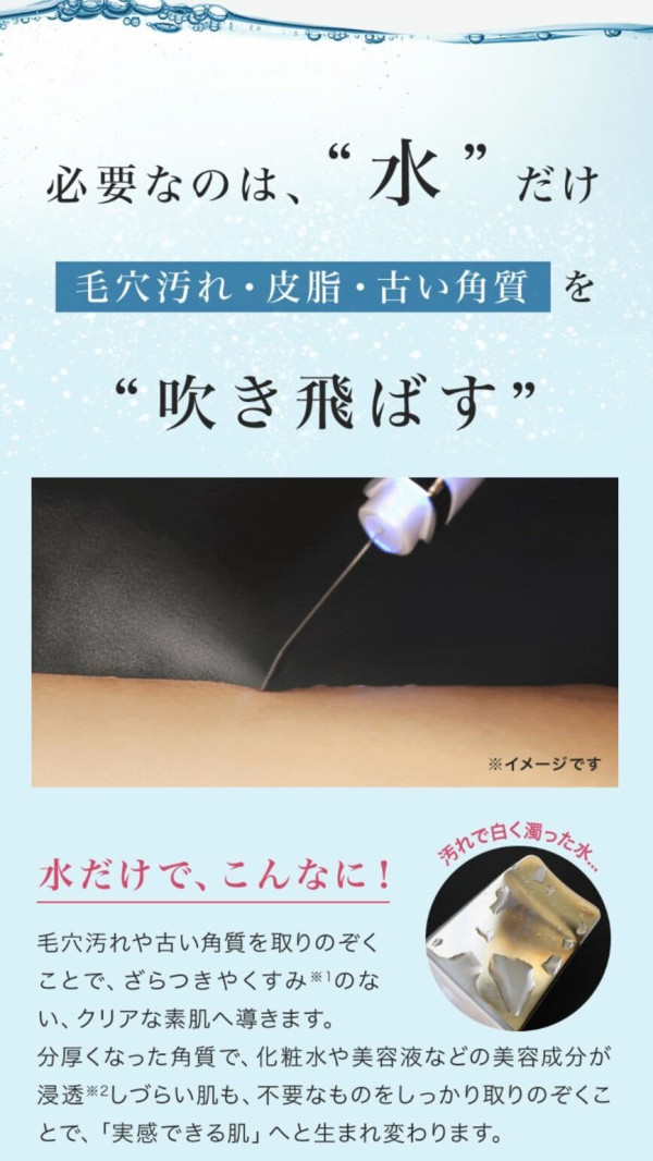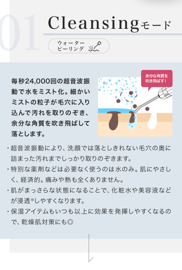 超音波で水分をミスト化させ、皮脂や毛穴の汚れ、古い角質などを浮かし吹き飛ばす