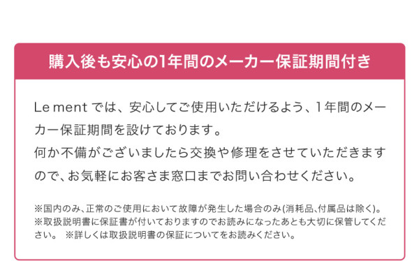 ・保証期間内に取扱説明書などの注意事項に従って正しい使用方法のもとで故障した場合に、無償修理もしくは交換させていただきます。・無償修理をご依頼になる場合は、商品に保証書・お買い上げレシートを添えていただき、お客さま窓口にお問い合わせください。