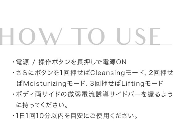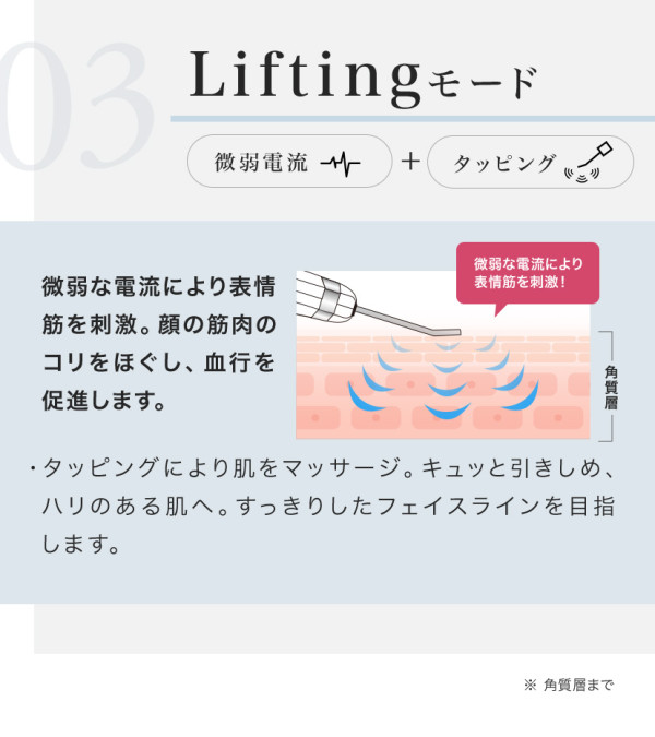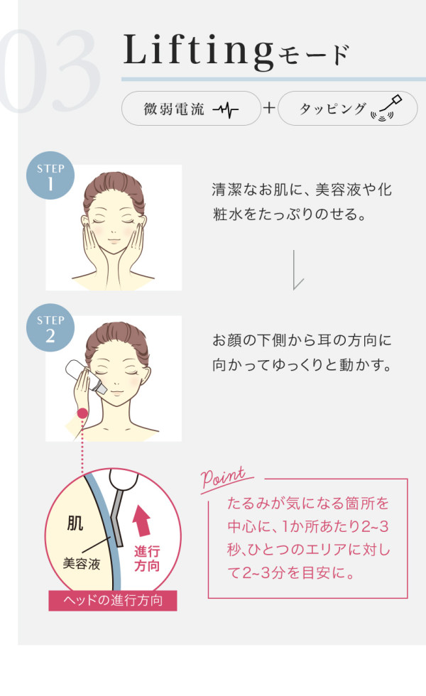 微弱の電流と超音波振動により、気になるシワやたるみをしっかり引きしめ、ハリのある肌に導く