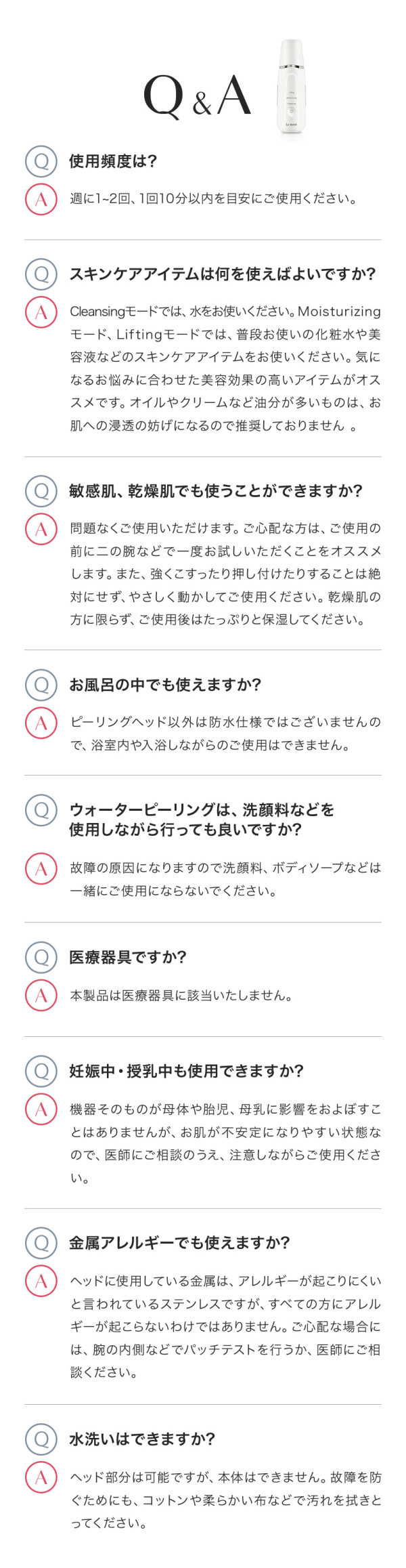 ・妊娠中、生理中の方(ホルモンバランスが不安定で、肌トラブルの原因になります。) ・乳幼児(手の届かない場所に保管し、使用させないでください。万が一、部品を誤飲してしまった場合は、ただちに医師にご相談ください。)