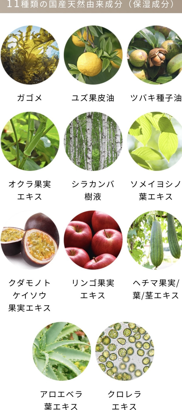 水、シクロペンタシロキサン、酸化チタン、グリセリン、メトキシケイヒ酸エチルヘキシル、BG、トリエチルヘキサノイン、セチルPEG/PPGー10/1ジメチコン、ラウリルPEGー9ポリジメチルシロキシエチルジメチコン、ビスエチルヘキシルオキシフェノールメトキシフェニルトリアジン、1,2ーヘキサンジオール、硫酸Mg、ジステアルジモニウムヘクトライト、ダイマージリノール酸(フィトステリル/イソステアリル/セチル/ステアリル/ベヘニル)、トリメチルシロキシケイ酸、ジイソステアリン酸ポリグリセリルー2、フェノキシエタノール、水酸化Al、ハイドロゲンジメチコン、キサンタンガム、加水分解カイメン、ケイ酸Ca、ケイ酸Na、シリカ、ガゴメ、緑茶葉、カンゾウ根エキス、アスコルビン酸、αーアルブチン、ナイアシンアミド、アストロカリウムムルムル種子脂、乳酸桿菌/加水分解コラーゲン発酵液エキス、アセチルヒアルロン酸Na、加水分解ヒアルロン酸、ユズ果皮油、トコフェロール、ツバキ種子油、オリーブ果実油、ヒト幹細胞順化培養液、ゲットウ花/葉/茎水、シラカンバ樹液、ヒアルロン酸Na、カミツレ花、シア脂、パパイン、ツボクサ葉エキス、イソマルト、トリ(カプリル酸/カプリン酸)グリセリル、レチノール、ペンチレングリコール、リンゴ果実培養細胞エキス、レシチン、トウキ根エキス、ソメイヨシノ葉エキス、アシタバ葉/茎エキス、クダモノトケイソウ果実エキス、リンゴ果実エキス、アルガニアスピノサカルス培養エキス、ローヤルゼリーエキス、加水分解シルク、プラセンタエキス、オクラ果実エキス、ヘチマ果実/葉/茎エキス、水溶性コラーゲン、加水分解コラーゲン、アロエベラ葉エキス、クズ根エキス、クロレラエキス、(+/-)マイカ、酸化鉄、メチコン