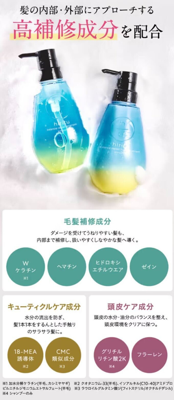 水、ラウロイルメチルアラニンNa、コカミドプロピルベタイン、グリセリン、ココイルメチルタウリンNa、コカミドDEA、ラウロイル加水分解シルクNa、ココイル加水分解ケラチンK(羊毛)、加水分解ケラチン(羊毛、カシミヤヤギ)、加水分解エンドウタンパク、加水分解ローヤルゼリータンパク、加水分解コメタンパク、加水分解ダイズタンパク、イソステアロイル加水分解ケラチン(羊毛)、イソステアロイル加水分解シルク、ヘマチン、ジラウロイルグルタミン酸リシンNa、シクロヘキサン-1,4-ジカルボン酸ビスエトキシジグリコール、ステアルジモニウムヒドロキシプロピル加水分解ケラチン(羊毛)、マカデミアナッツ脂肪酸フィトステリル、メドウフォーム-δ-ラクトン、γ-ドコサラクトン、(ジヒドロキシメチルシリルプロポキシ)ヒドロキシプロピル加水分解シルク、加水分解ゴマタンパクPGプロピルメチルシランジオール、クオタニウム-33(羊毛)、クエン酸、ゼイン、ポリクオタニウム-10、ポリクオタニウム-65、フラーレン、グリチルリチン酸2K、(メタクリル酸グリセリルアミドエチル/メタクリル酸ステアリル)コポリマー、加水分解シルク、加水分解コンキオリン、加水分解ヒアルロン酸、ヒアルロン酸ヒドロキシプロピルトリモニウム、セラミドNG、セラミドNP、セラミドAP、PCA-Na、乳酸Na、アルギニン、アスパラギン酸、PCA、グリシン、アラニン、セリン、バリン、プロリン、トレオニン、イソロイシン、ヒスチジン、フェニルアラニン、アルガニアスピノサ核油、ホホバ種子油、ワサビノキ種子油、サルビアヒスパニカ種子油、ローマカミツレ花エキス、トウキンセンカ花エキス、ヤグルマギク花エキス、カミツレ花エキス、セイヨウオトギリソウ花/葉/茎エキス、フユボダイジュ花エキス、コレステロール(羊毛)、PPG-3カプリリルエーテル、ステアラミドプロピルジメチルアミン、セバシン酸ジエチル、イソステアリン酸、イソノナン酸イソノニル、ジステアリルジモニウムクロリド、安息香酸Na、EDTA-2Na、BG、DPG、PG、PVP、エタノール、トコフェロール、フェノキシエタノール、香料