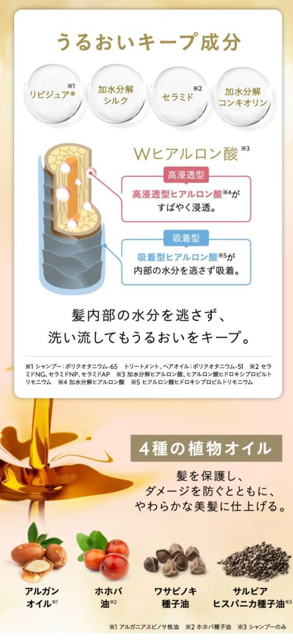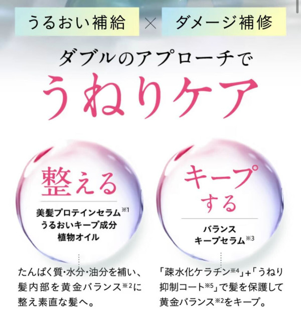 「疎水化ケラチン※4」+「うねり抑制コート※5」で髪を保護して黄金バランス※をキープ。