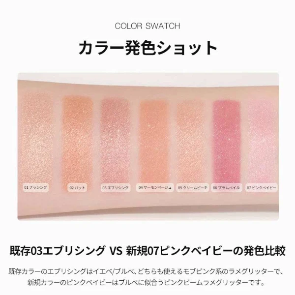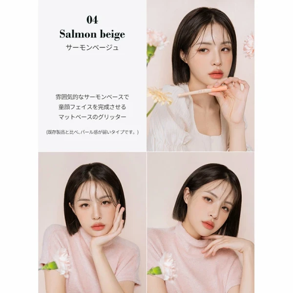 ・雰囲気的なサーモンベースで童顔フェイスを完成させるマットベースのグリッター(既存製品と比べ、パール感あ弱いタイプです)