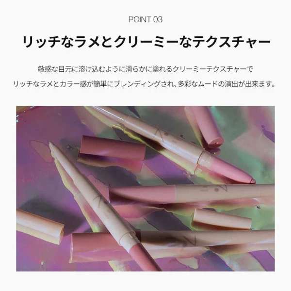 敏感な目元に溶け込むように滑らかに塗れるクリーミーテクスチャーでリッチなラメとカラー感が簡単にブレンディングされ、多彩なムードの演出ができます