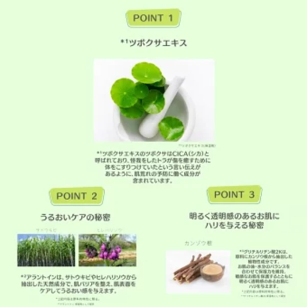 敏感な肌を治癒する力を持つツボクサエキスが含有され荒れた肌キメをなめらかに整え美しく清潔な肌に導きます