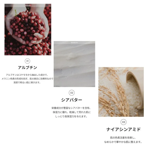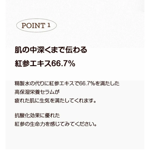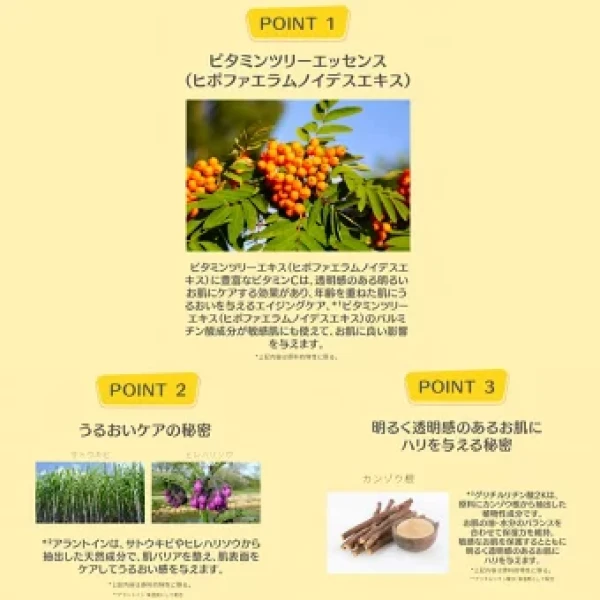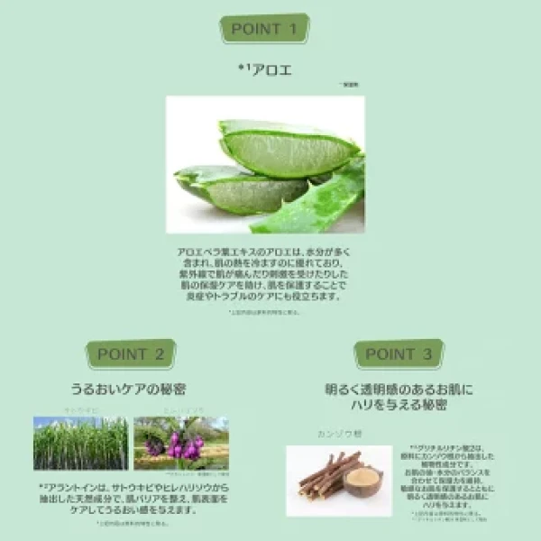 ・原料にカンゾウ根から抽出した植物成分グリチルリチン酸2で、敏感なお肌を保護すると共に明るく透明感のあるお肌にハリを与えます