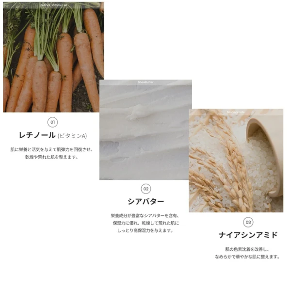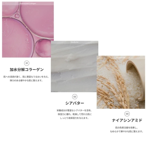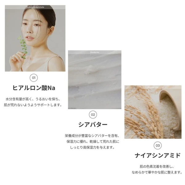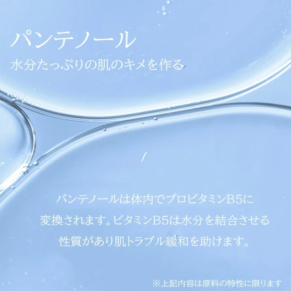 水、グリセリン、BG、グリセレス-26、ナイアシンアミド、PEG/PPG-17/6コポリマー、トレハロース、ポリソルベート80、1,2-ヘキサンジオール、フェノキシエタノール、カルボマー、キサンタンガム、アラントイン、アデノシン、TEA、ヒアルロン酸Na、ドクダミエキス、ヨモギエキス、ヤマザクラ胎座培養エキス、エチルヘキシルグリセリン、香料