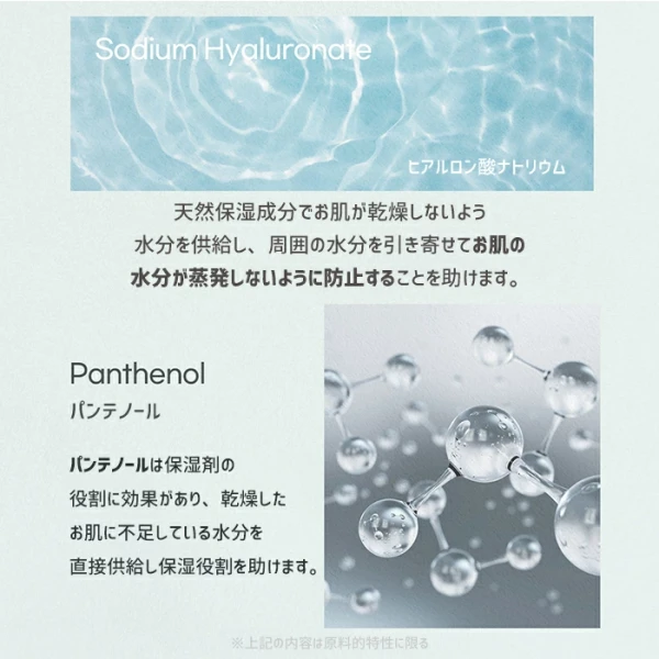 水、グリセリン、BG、ヒアルロン酸Na、グリセレス-26、PEG/PPG-17/6コポリマー、ポリソルベート80、フェノキシエタノール、1,2-ヘキサンジオール、TEA、カルボマー、キサンタンガム、トレハロース、アラントイン、グリチルリチン酸2K、ツボクサエキス、ヨモギエキス、ティーツリーエキス、香料