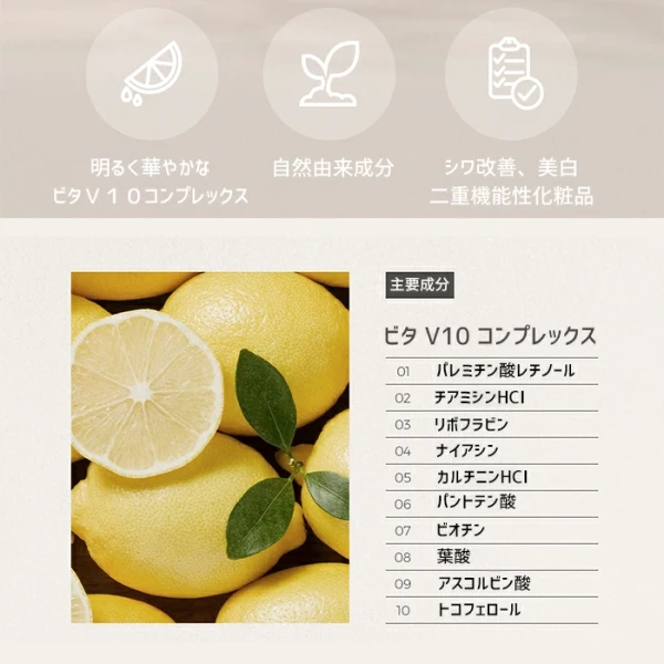 水、BG、DPG、グリセリン、プロパンジオール、1,2-ヘキサンジオール、ヒドロキシアセトフェノン、ナイアシンアミド、ベタイン、レモン果実エキス、アラントイン、ラウリン酸ポリグリセリル-10、キサンタンガム、ヒポファエラムノイデスエキス、ヒアルロン酸Na、カルボマー、イミノジコハク酸4Na、レモン果皮油、エチルヘキシルグリセリン、パントテン酸Ca、マルトデキストリン、オクテニルコハク酸デンプンNa、アスコルビルグルコシド、グリチルリチン酸2K、チャ葉エキス、ライム果実エキス、カリンエキス、マコンブエキス、オレンジ果実エキス、メシマコブエキス、トマト果実エキス、アスコルビルリン酸Na、酢酸トコフェロール、ピリドキシンHCl、シリカ、リモネン