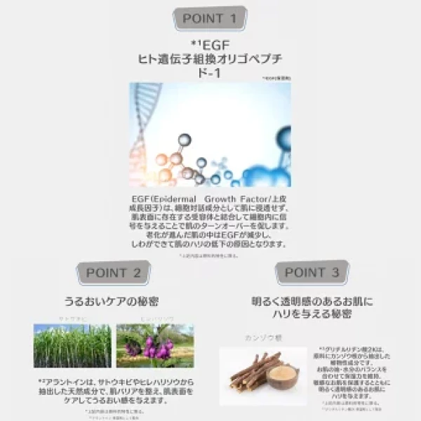・EGFは細胞対話成分として肌に浸透せず、肌表面に存在する受容体と結合して細胞内に信号を与えることで肌のターンオーバーを促します(老化が進んだ肌の中にはEGFが減少し、しわができて肌のハリ低下の原因となります)