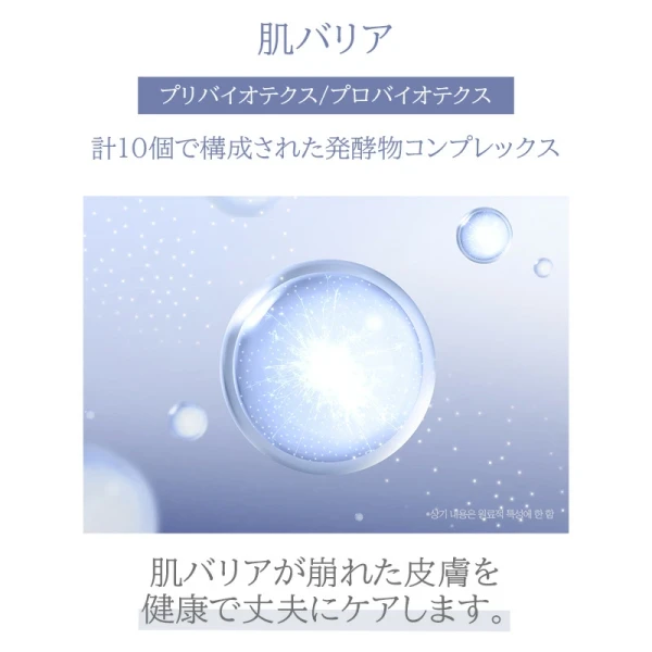 水、グリセリン、BG、グリセレス-26、ナイアシンアミド、PEG/PPG-17/6コポリマー、トレハロース、ポリソルベート80、1,2-ヘキサンジオール、フェノキシエタノール、カルボマー、キサンタンガム、アラントイン、TEA、アデノシン、ヒアルロン酸Na、ツボクサエキス、ドクダミエキス、エチルヘキシルグリセリン、合成ヒト遺伝子組換オリゴペプチド-1、香料