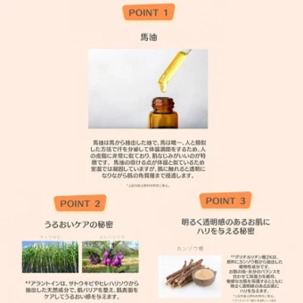 ・馬油は馬から抽出した油で、馬は唯一人と類似した方法で汗を分泌して体温調節するため、人の皮脂に非常に似ており、肌なじみがいいのが特徴です。馬油の溶ける点が体温と似ているため室温では凝固していますが、肌に触れると透明になりながら肌の角質層まで浸透します
