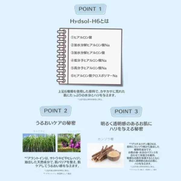 ・肌の水分を補い保ち、潤いを与え、透明感のある肌へ整え保つ