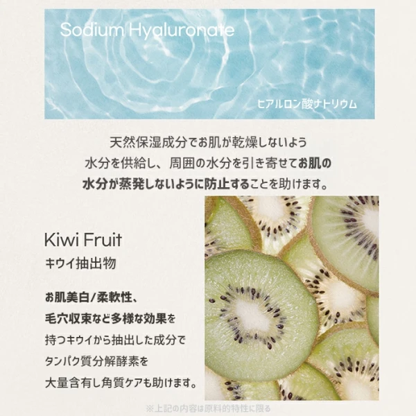 水、グリセリン、BG、グリセレス-26、ナイアシンアミド、PEG/PPG-17/6コポリマー、トレハロース、ポリソルベート80、1,2-ヘキサンジオール、フェノキシエタノール、カルボマー、キサンタンガム、アラントイン、TEA、アデノシン、シラカンバ樹液、メセムブリアンテムムクリスタリヌムエキス、ヒアルロン酸Na、キュウリ果実エキス、カプリリルグリコール、エチルヘキシルグリセリン、香料