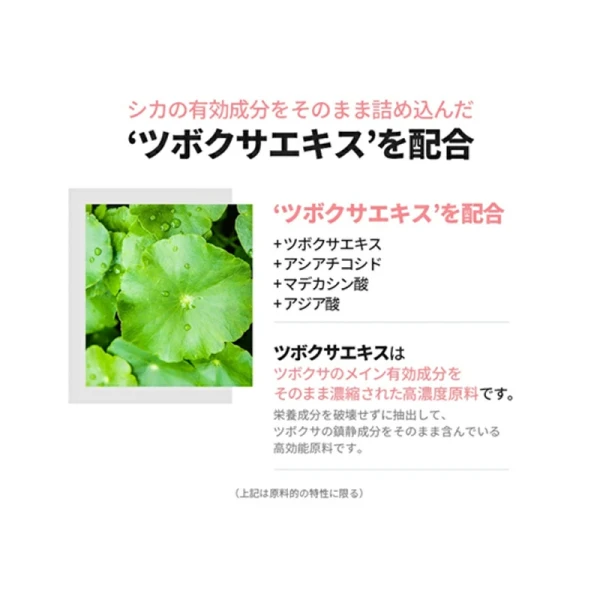 ・ツボクサエキスのツボクサはCICAと呼ばれており、怪我をした虎が傷を癒すために体をこすりつけていたという言い伝えがあるように、肌荒れの予防に働く成分が含まれています。