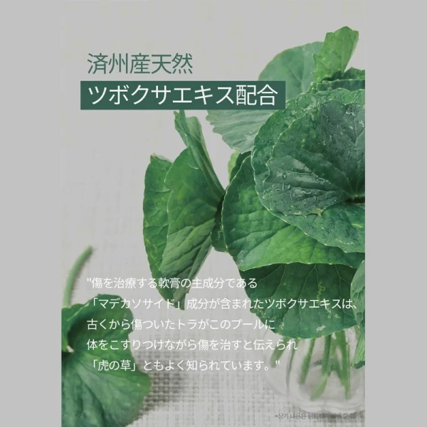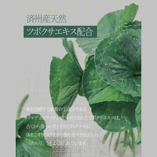 傷を治療し、軟膏の主成分であるマデカソサイド成分が含まれたツボクサエキスは、古来から傷ついた虎がこの草に体をこすり傷を治療すると伝えられ【虎の草】とも呼ばれています。荒れた肌質をなめらかに整え、健康で清潔な肌へと導きます。