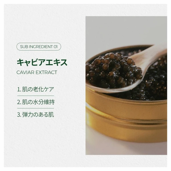 ・肌の老化ケア/肌の水分維持/弾力のある肌へ導くキャビアエキス配合・水分蒸発防止/天然保湿成分/ツヤ溢れる肌へ導くヒアルロン酸NAh配合