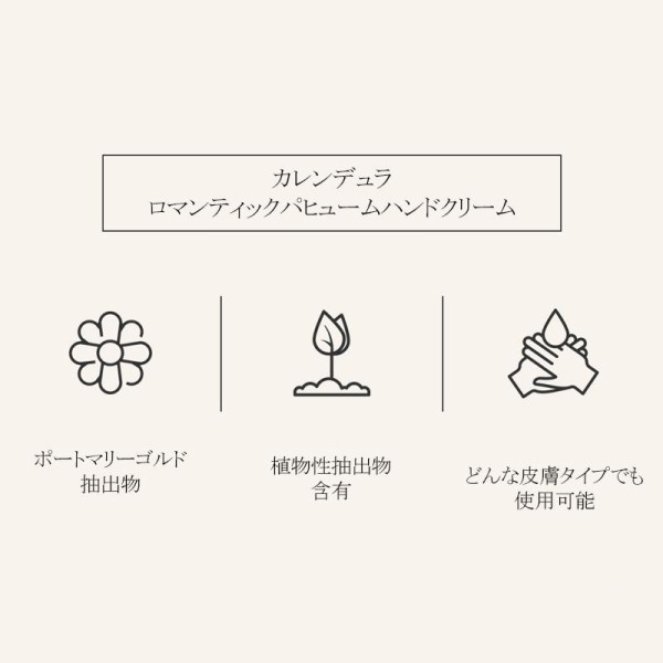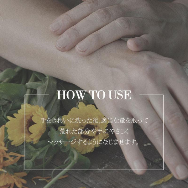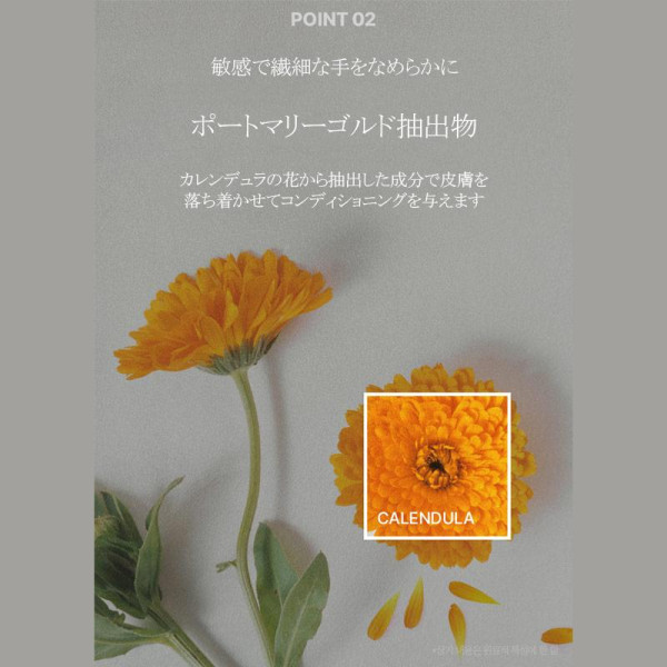 カレンデュラの花から抽出した成分で皮膚を落ち着かせ、敏感で繊細な手をなめらかに