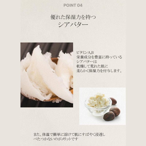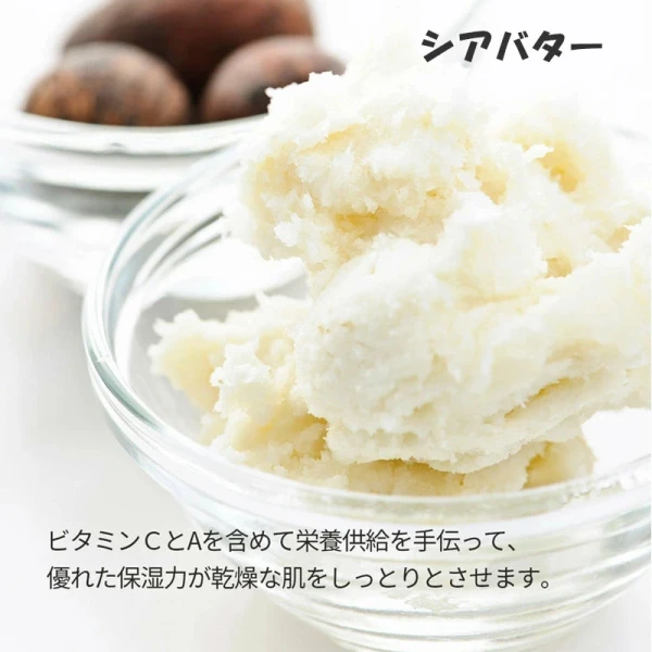 ビタミンA.B栄養成分を豊富に持っているシアバターは乾燥して荒れた肌に柔らかく保湿力を与えます