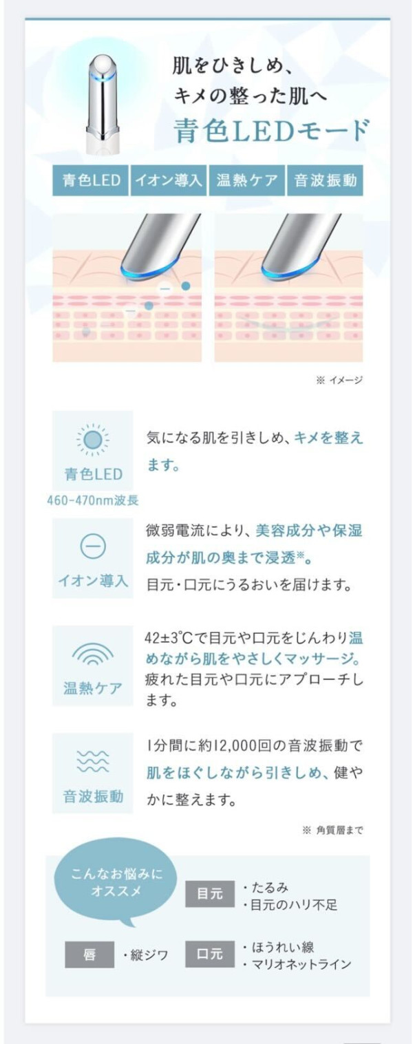 ほうれい線やマリオネットラインが 目立つと、一気に老けた印象に。 音波振動と赤色/青色LEDで引き しめて、若々しい口元を叶えます。